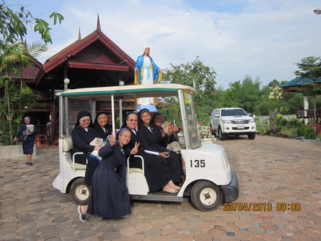 หลังวันเสาร์ที่ 20 เมษายน 2556 ของงานฉลอง 50 ปี และ 60 ปี ครบรอบการถวายตัวของคุณแม่โรสลิน ศรีไพร กระทอง และสมาชิกรักกางเขน ร่วมรุ่น ทั้งวัยวุฒิ และศรัทธาวุฒิ อีก 8 ท่าน แล้วซิสเตอร์เจ้าภาพบ้านกบินทร์บุรี พร้อมกับซิสเตอร์อีกบางท่านที่ลงนามอย่างกล้าหาญ กับการปรากฏตัวเพื่อเข้ารับการอบรมภาษาอังกฤษ โดย ทีมวิทยากรของสถาบันแทมบริท สำเนียงนักข่าว CNN ในระหว่างวันที่ 22 – 26 เมษายน 2556 ณ โรงเรียนมารีวิทยากบินทร์บุรี ก็ได้เดินทางล่วงหน้ามาก่อนซิสเตอร์ท่านอื่นๆ ด้วยคติพจน์ที่ว่า...มาก่อน อิ่มก่อน (นอนอิ่ม เล่นอิ่ม พักผ่อนอิ่ม) นับว่าคติพจน์ดังกล่าว...กลายเป็นความจริง เพราะมื้อเย็นแรกกับอาหารที่สวนอาหารเนินน้ำ ใกล้ๆกับโรงเรียนมารีฯ กบินทร์ฯ ได้เรียกน้ำย่อยให้กับกลุ่มนำร่อง มื้อกลางวันอีกมื้อที่ร้านอาหารเวียดนาม พร้อมกับการ...ช้อปปิ้ง...ที่ตลาดชายแดนไทย-กัมพูชา (โรงเกลือ อรัญประเทศ) สร้างความอิจฉาเล็กๆ ให้กับซิสเตอร์ท่านอื่นๆ ที่ทยอยเข้าที่พักในวันถัดมาได้เหมือนกัน ความกลัว..กับการทักทายด้วยภาษาอังกฤษหายไปแต่เมื่อไร ไม่มีใครได้ทันสังเกต เพราะเมื่อมิสเตอร์พอล เจ้าของสถาบันแทมบริท ได้สร้างเสียงหัวเราะ เสียงสนทนา เสียงเพลง แม้วันแรกของการอบรมผ่านไปด้วยความเหนื่อยล้าของ ริมฝีปาก ที่ต่างฝ่ายต่างจะต้องแข่งขันกัน...ว่า...ใครจะทำปาก-ลิ้น-ฟัน-เพดานปาก ได้แนบเนียนกว่ากัน สำเนียงภาษาอังกฤษจะดี ขึ้นอยู่กับยุทธศาสตร์นี้แต่เพียงอย่างเดียว ซิสเตอร์ฝึกไปด้วยการสลับกับการดื่มน้ำไป และแล้ว...ความเข้มข้นของการฝึกฝนการใช้ภาษาอังกฤษก็มาถึง ...เมื่อมีการรางวัลเพื่อเป็นขวัญและกำลังใจกับบรรดาซิสเตอร์ ใครออกเสียงได้ชัดเจน ทำเวลาได้ ร้องเพลงไพเราะ เน้นเสียงถูกต้อง ธนบัตรสีเขียว และสีแดง...วางบนโต๊ะด้านหน้าเวทีภายในห้องประชุมชั้น 5 ของอาคารเซนต์แอนนา ซิสเตอร์หลายท่านสลัดความเหนียมอาย สลับผลัดเปลี่ยนกันขึ้นคว้าไมล์ เพื่อรับธนบัตร (บางท่านก็มีค่ารถกลับบ้านสบายๆ) มีแต่เสียงชมมิสเตอร์พอลว่า...ใจดีจริงๆ มาอบรมให้แล้ว ยังแจกสตางค์อีก อย่างนี้ จัดอบรมทุกปีนะคะ นอกจากจะสนุกสนานและได้สตางค์กับการเข้าคอร์สภาษาอังกฤษแล้ว ยังมีการพักผ่อนหน่อยใจ ตกปลาในสวน Fatima Garden ของโรงเรียนมารีฯ กบินทร์ฯ ร่วมกันปั่นจักรยาน หรือออกกำลังกายที่สระว่ายน้ำ และเพราะกิจกรรมเสริมเหล่านี้ บรรยากาศของ 4 – 5 วันนี้ จึงเป็นเสมือนน้ำทิพย์หล่อเลี้ยงชีวิตหมู่คณะได้เป็นอย่างดี เพราะบรรยากาศที่สดชื่น ได้สร้างความสุขขึ้นในใจของซิสเตอร์หลายท่าน โดยเฉพาะอย่างยิ่ง ค
